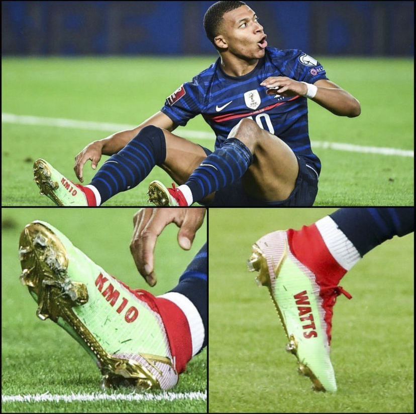 Kylian Mbappé trong màu áo đội tuyển Pháp cùng với Mercurial Superfly được thiết kế đặc biệt từ dịch vụ Nike ID. Thân giày màu xanh nhạt, phần cổ chun màu đỏ nổi bật với các điểm nhấn và mặt đế màu vàng, phía lòng trong mỗi bên là dòng chữ “MP10” và “WATTS”