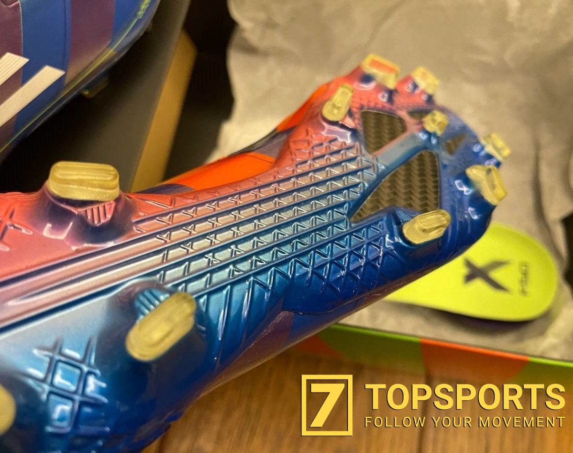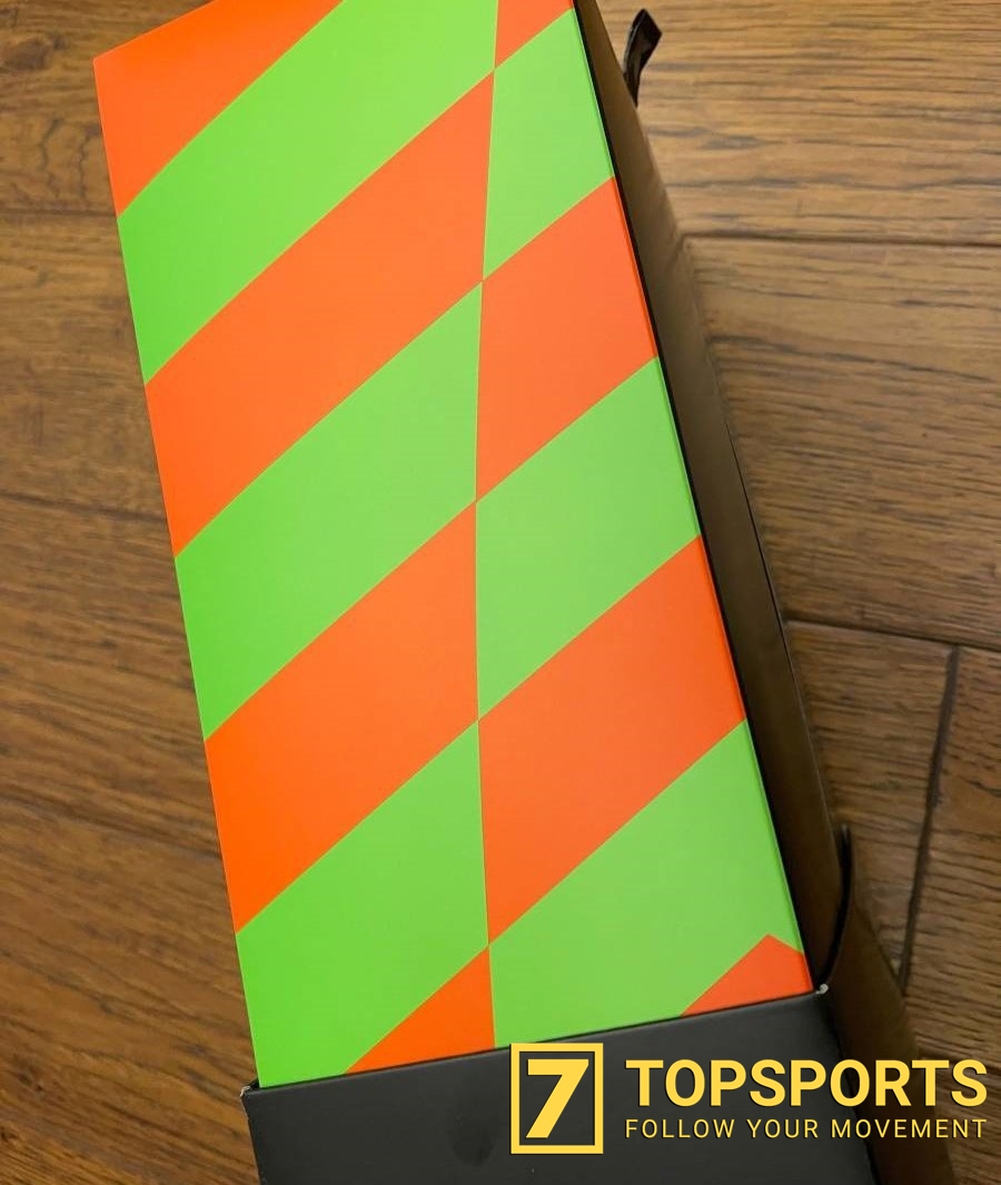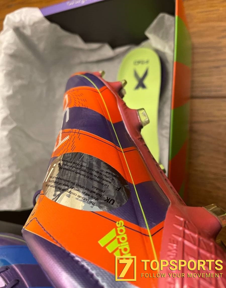 Nào cùng mở hộp ra và ta thấy ngay được các hoạ tiết cùng kiểu dáng đặc trưng của những đôi F50 với phần chất liệu cực kỳ mỏng và linh hoạt, thân giày có kết cấu giúp bạn tăng thêm độ bám vào bóng ở các điểm nhấn tạo ma sát. Gam màu kết hợp từ 2 mẫu thiết kế Chameleon và Crazylight thật sự đặc biệt với sọc cam - tím ở bên trong và màu tím - xanh ở bên ngoài, điều thú vị là phần đế ngoài cũng tuân theo yếu tố màu sắc như vậy