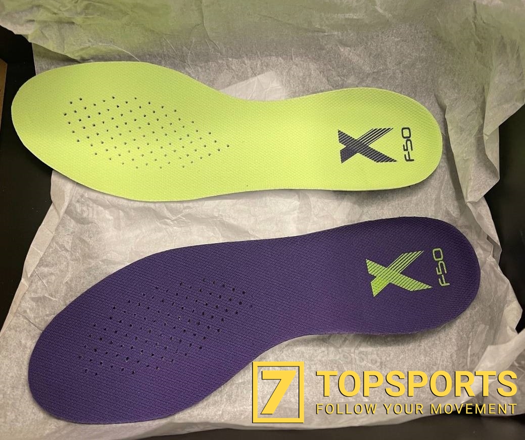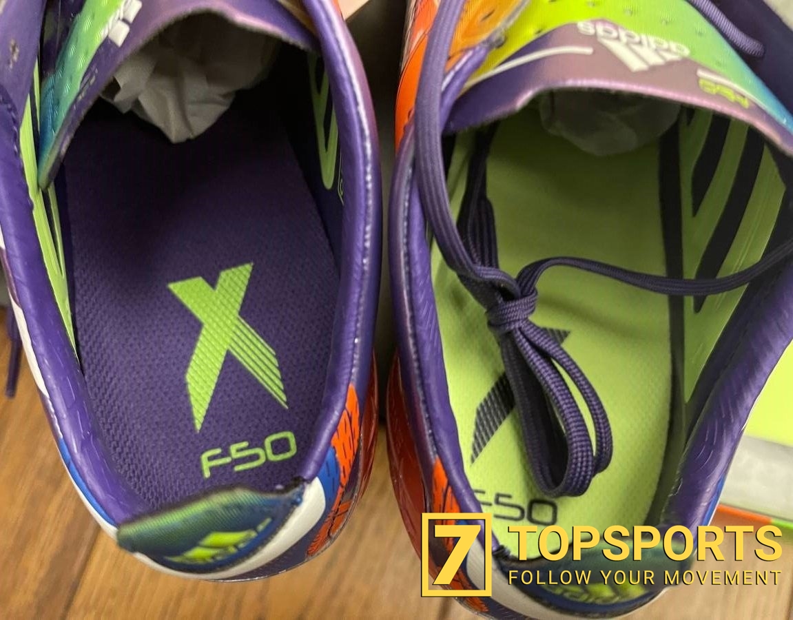 Phần lót giày cũng khá đặc sắc với màu tím bên trái và màu xanh lá cây bên phải, ngoài ra logo adidas ở phía gót và mặt đế là 'Speedframe' thì chúng ta đã được thấy trên X Ghosted +